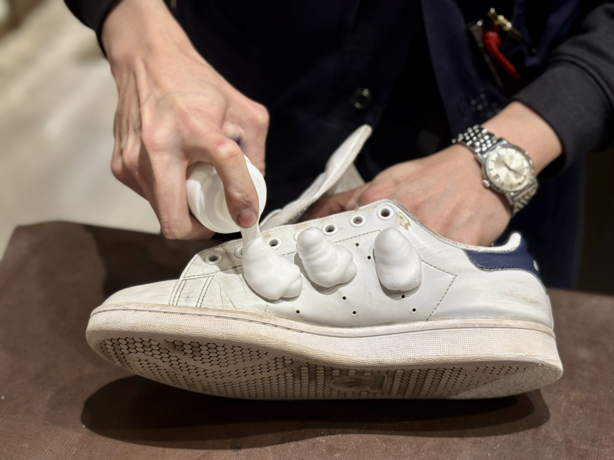 まずは、スニーカー泡クリーナーを靴表面に数プッシュします。