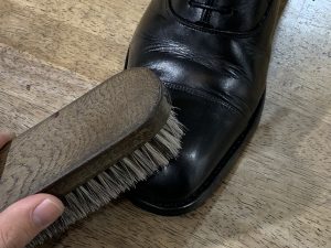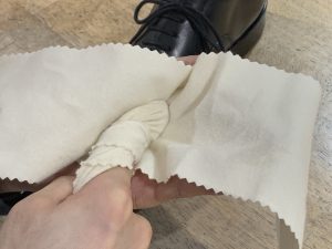 通常のケアを終えた靴に、まずはプライマーを少量指塗りします。