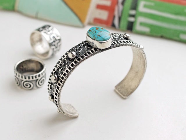 ナバホ出身アーティストが作るジュエリーは、就労人口が他部族よりも比較的多い事などから、生産数も他より多く、またデザインや製作方法もとても多彩です。